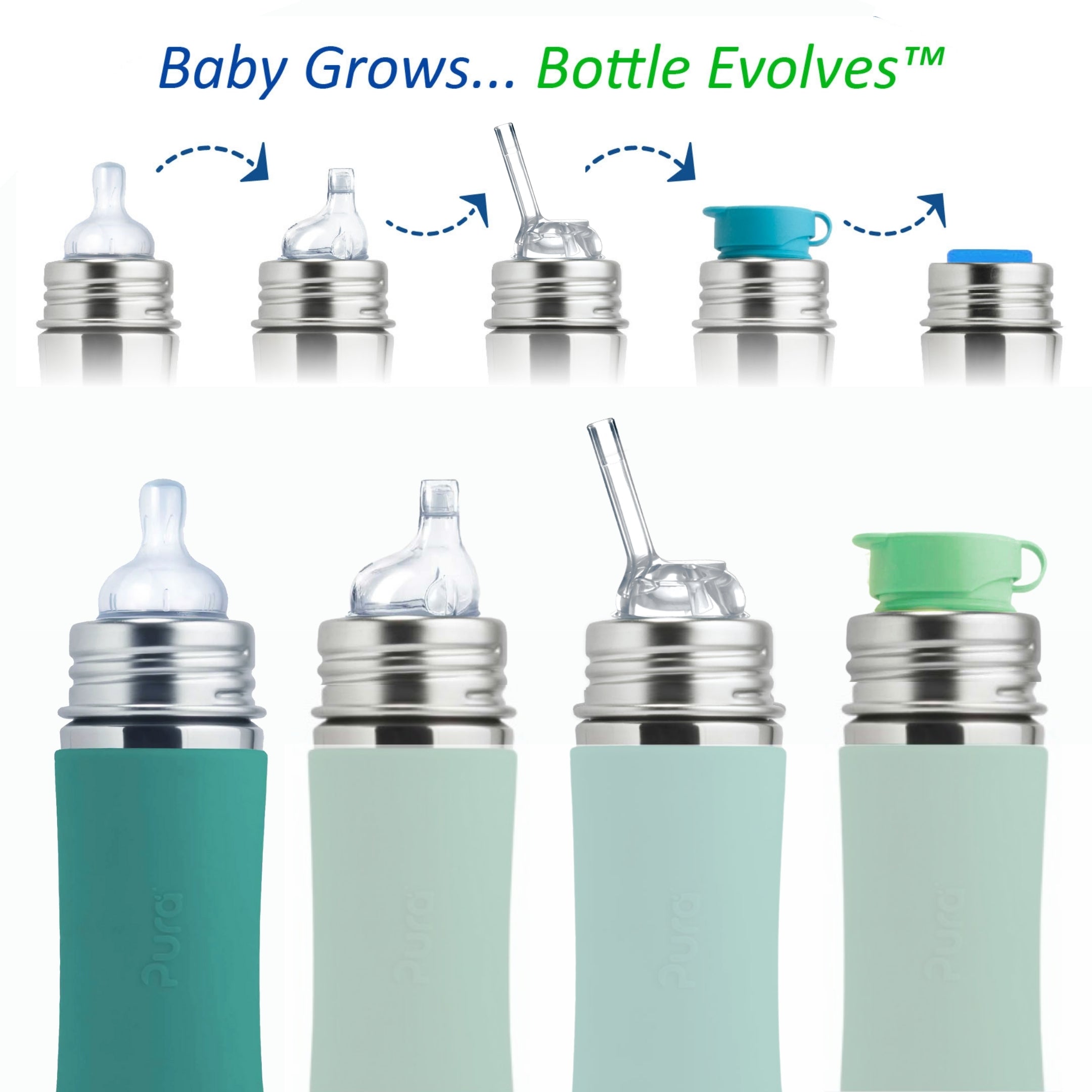 Any Pura silicone lid is suitable for any Pura bottle – these are durable bottles that “grow” with the baby! With the help of a replaceable tops, the bottle can easily turn into a sippy/straw bottle, a jar for snacks or a sport bottle.