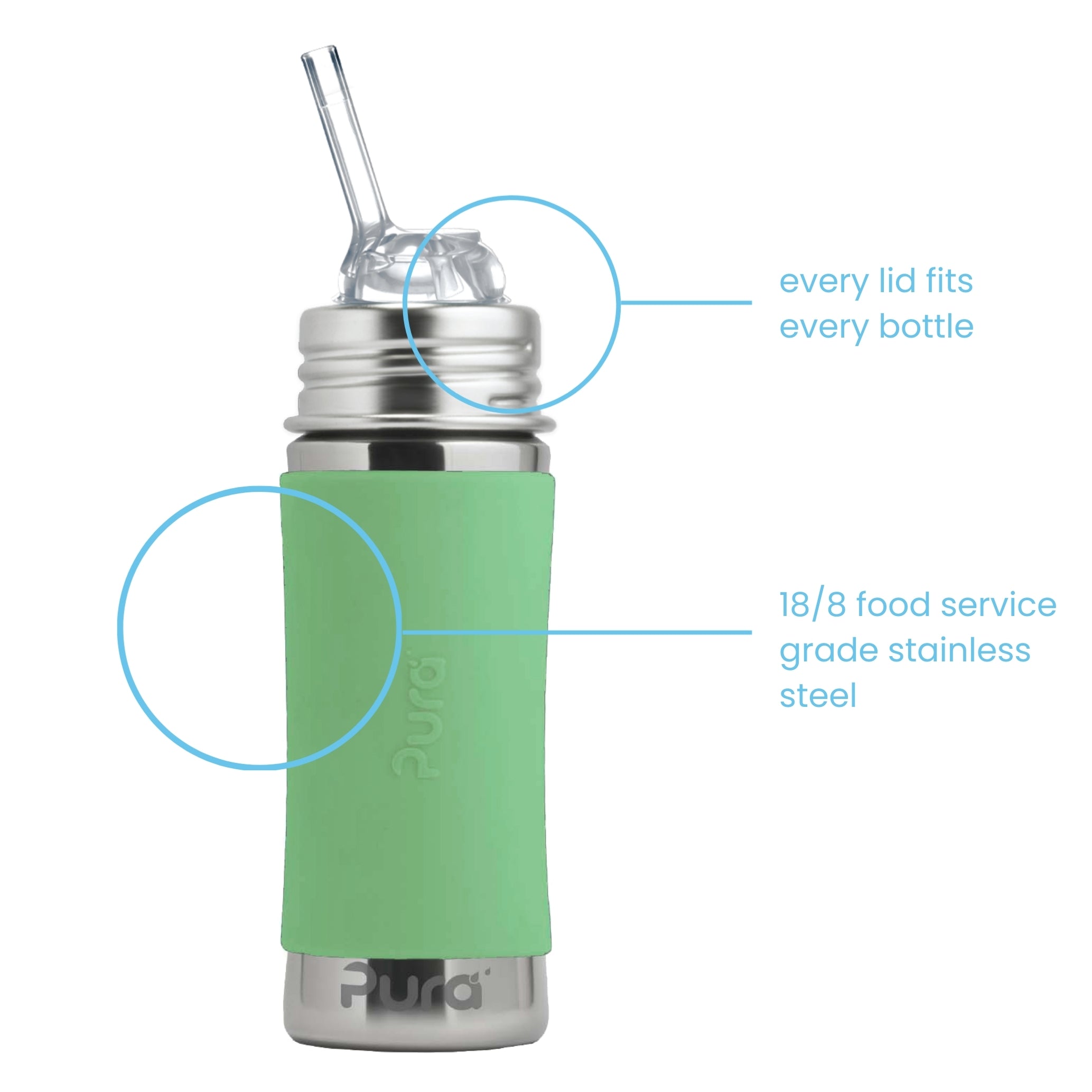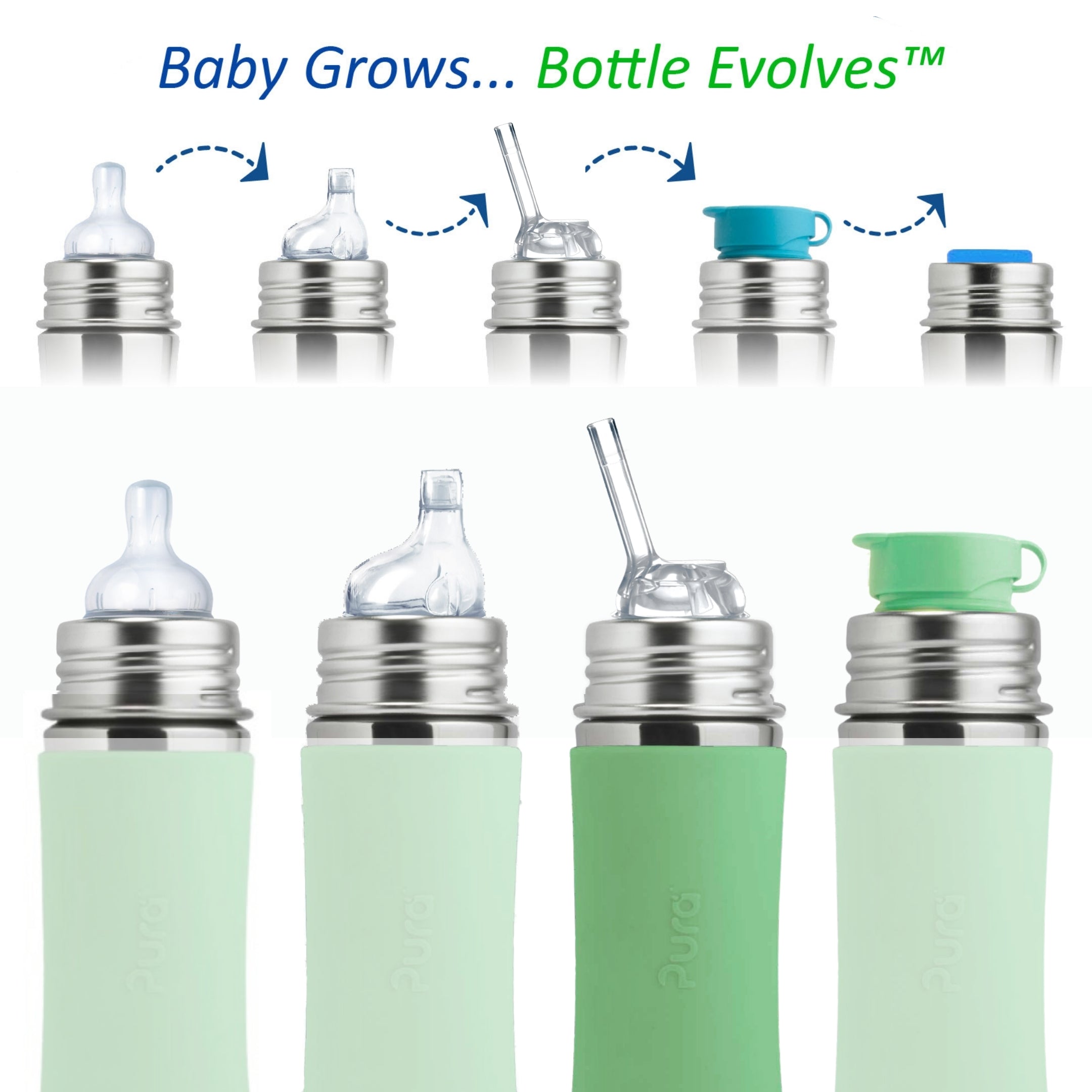 Cualquier tapa de silicona Pura es compatible con cualquier botella Pura: ¡son botellas duraderas que “crecen” con tu bebé! Cambiando la tapa, la botella puede convertirse fácilmente en biberón con pico o tetina, botella para beber o recipiente para snacks.