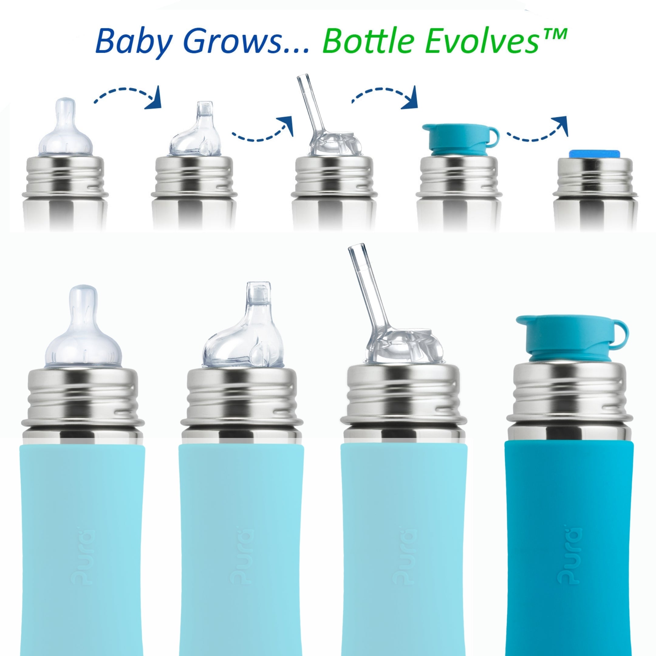 Cualquier tapa de silicona Pura es compatible con cualquier botella Pura: ¡son botellas duraderas que “crecen” con el bebé! Cambiando la tapa, la botella puede convertirse fácilmente en biberón con pajita, biberón con pico/tetina o recipiente para snacks.