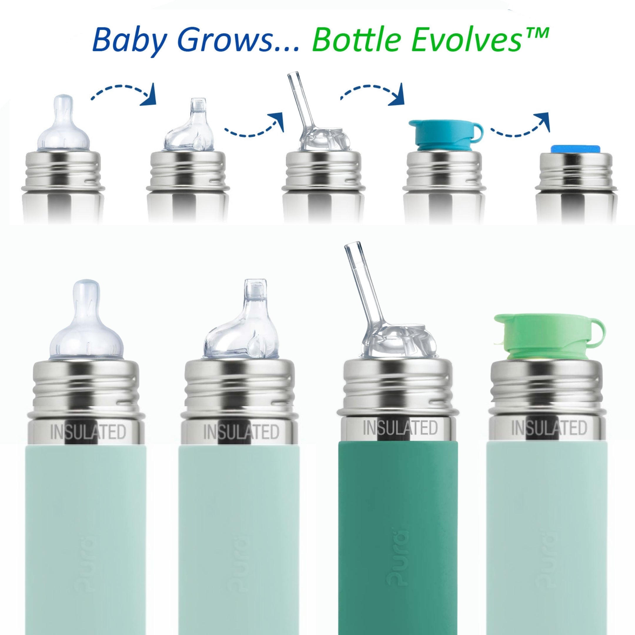 Mikä tahansa Pura-silikonikansi sopii mihin tahansa Pura-pulloon – nämä ovat kestäviä pulloja, jotka ”kasvavat” vauvan mukana! Vaihdettavan korkin avulla pullosta voi helposti tehdä nokka- tai tuttipullon, juomapullon tai välipalasäiliön.
